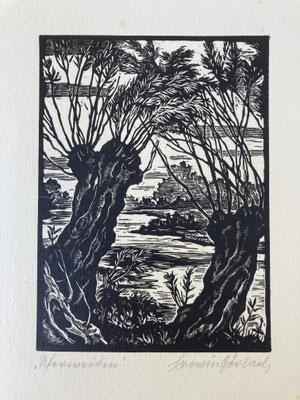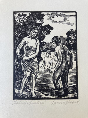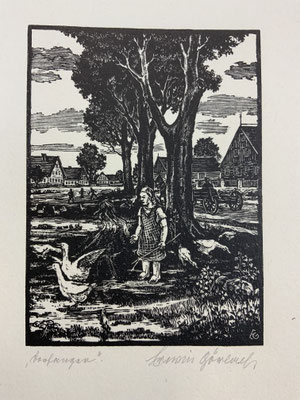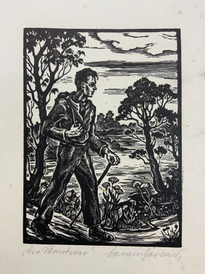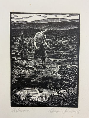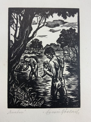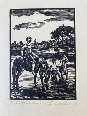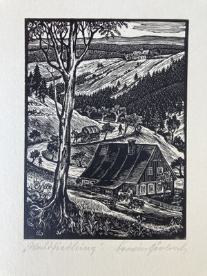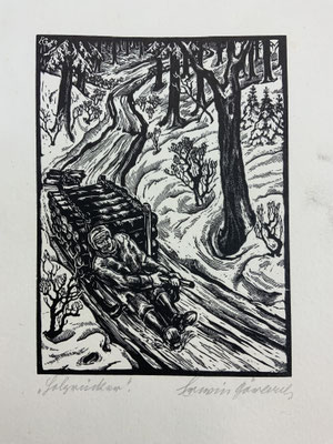 Vor einiger Zeit erwarb ich online in einem Antiquariat eine Serie von 5 Holzschnitten, welche Erwin Görlach noch in seiner „alten Heimat“ angefertigt hatte. Um zu erfassen, was sich hinter diesen Motiven verbirgt, möchte ich an dieser Stelle das Buch: „Als Deutscher unterwegs“ von Frank Sikora erwähnen und hier besonders aus den Seiten 30 - 32 zitieren. Frank Sikora schildert aus seinen Kindheitserlebnissen sowohl den nicht ungefährlichen Prozess, die Baumstämme im Winter mit Pferdeschlitten ins Tal zu bringen, wie auch die hohe Kunst, im Sommer die Forellen im Fluß mit den eigenen Händen zu fangen.
